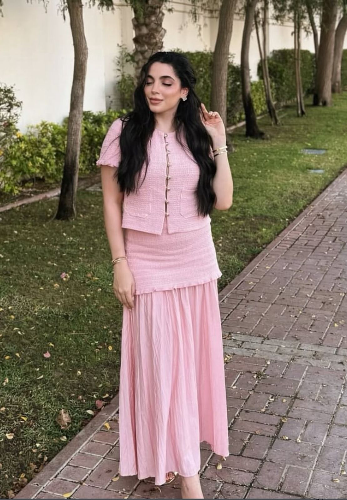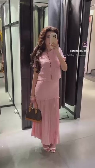 Elevate your wardrobe with the Blush Breeze Co-Ord Set FT223, crafted from premium-quality knit fabric. This two-piece ensemble features a round-neck knitted jacket paired with a high-waist midi skirt that combines pleated fabric and an elasticated waistband for comfort and style. Perfectly balanced for a refined, expert look, this set offers both elegance and ease for versatile wear.