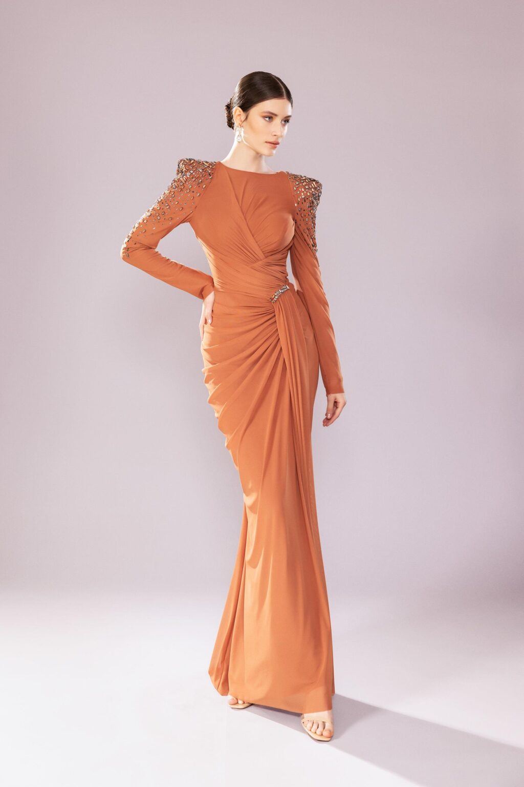 Elevate your formal wear with the Draped Embellished Gown FT347, designed to combine sophistication and detailed craftsmanship. Featuring expertly draped fabric complemented by subtle embellishments, this gown offers a graceful silhouette that enhances your presence at any event. Its refined construction ensures a comfortable fit while highlighting intricate textures, making it an impeccable choice for occasions demanding elegance and style.