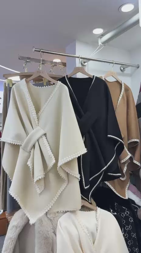 Eliza Warm Cape FT435 The Eliza Warm Cape delivers sophisticated layering for transitional seasons. Crafted with premium fabric, this versatile piece drapes elegantly over your shoulders, providing warmth without bulk. The structured design flatters various silhouettes while maintaining effortless style. Perfect for evening occasions or casual outings, it pairs seamlessly with dresses, tops, and formal wear. The quality construction ensures durability through repeated wear, making it a reliable investment for your wardrobe. An essential accessory that elevates any ensemble with understated elegance.