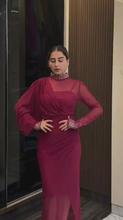This embellished draped gown FT304 combines sophisticated craftsmanship with elegant design. Carefully adorned with delicate embellishments, its draped silhouette enhances natural curves while offering a flattering fit. Ideal for formal occasions, this gown balances glamour with comfort, ensuring you make a refined statement wherever you wear it.