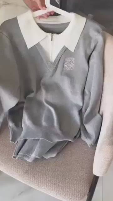 Logo Embroidered Collar Patterned Knitted Coord Set FT383