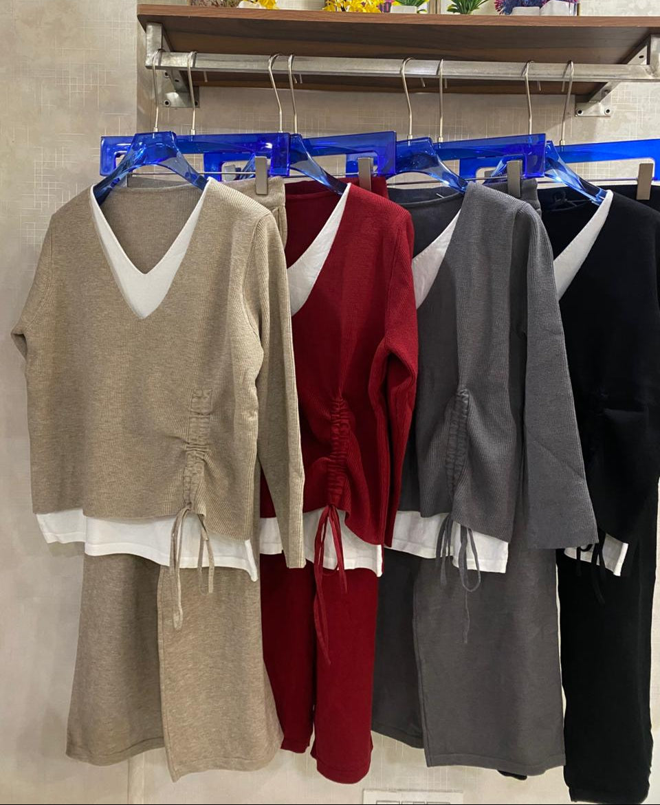 Elevate your wardrobe with this sophisticated ruched V-neck layered coord set. The expertly designed silhouette features strategic ruching that flatters your figure while the layered construction adds depth and dimension. The V-neckline creates an elongating effect, perfect for creating a polished, intentional look. Versatile enough for both casual outings and semi-formal occasions, this set combines contemporary design with timeless appeal. The coordinated pieces work seamlessly together or can be styled separately for multiple outfit combinations. An essential addition for those who appreciate quality construction and refined aesthetics.