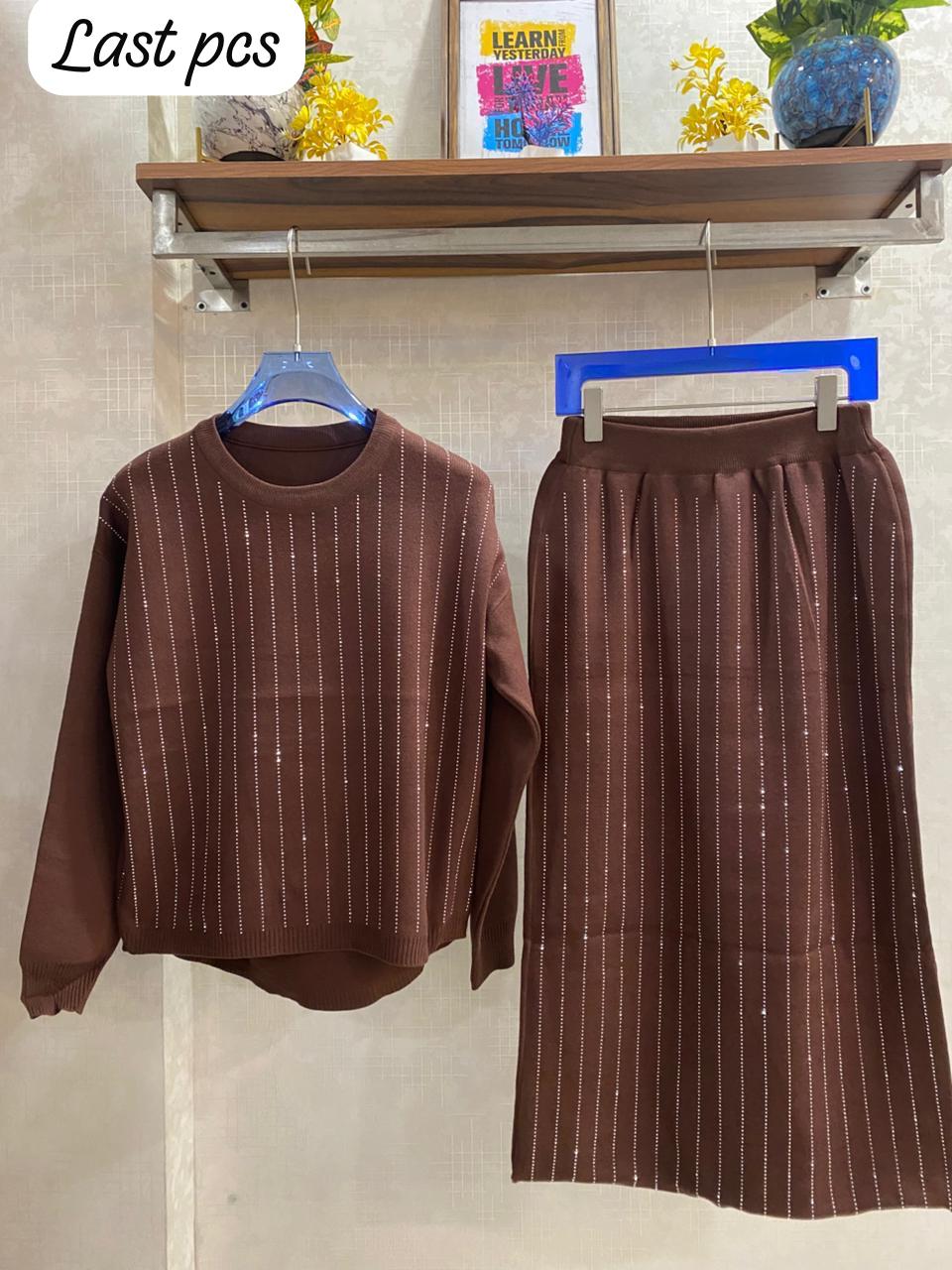 Elevate your wardrobe with the Sequence Detailed Knitted Skirt Set FT231, designed for a refined and comfortable fit. Crafted from premium knitted fabric, this set features exquisite sequence detailing that adds subtle elegance. Available in a versatile free size that accommodates S through XXL, it ensures a flattering silhouette for various body types. Perfect for both casual and semi-formal occasions, this skirt set combines style with comfort, making it a sophisticated addition to your collection.